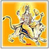 Mercury is attired in yellow apparels and wears a garland of yellow flowers. The radiance and glow of his body is like that of an oleander flower. He has a sword, a shield a mace in each of his three hands respectively and his fourth hand is raised in the posture of giving blessings. He has a golden crown on his head and a beautiful garland in his neck. His vehicle is a lion.